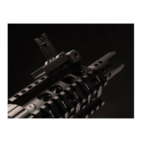 The ergonomic pistol grip, complete with palm swell and tactile texture, locks your hand into place for rock-steady aim and rapid target acquisition. The quad-rail handguard offers endless customization, so you can mount lights, lasers or foregrips exactly where you need them. Foldable front and rear sights adjust windage and elevation in seconds, ensuring you stay on target, round after round.
