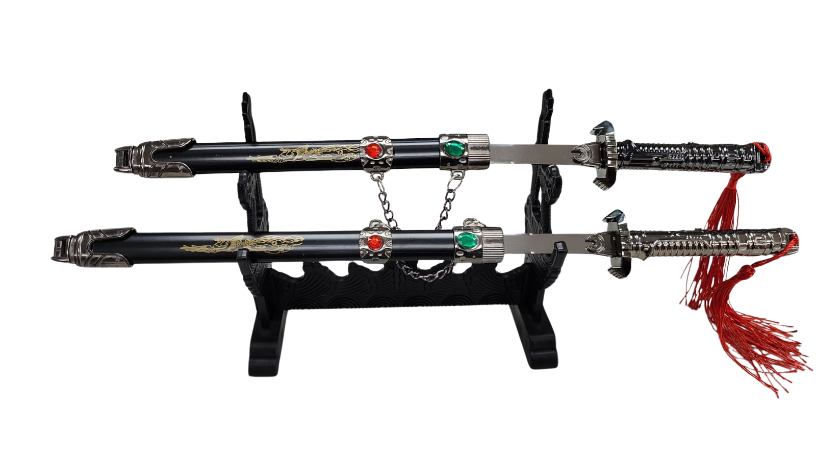 The included stand allows for easy setup and a clean presentation, making this set a standout decorative piece. The added chain and ornamental detailing on the scabbards give it a unique, eye-catching design that elevates it beyond standard display items.