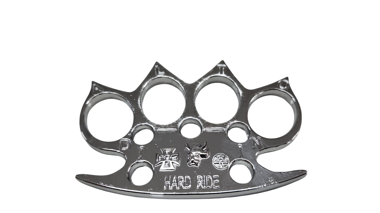 The FAS7-3 Knuckle Duster Silver Hard Ride is a solid, full-hand knuckle duster designed with a distinctive wide-frame structure and aggressive styling. Featuring a polished silver finish and engraved “Hard Ride” detailing, this model stands out with its rugged aesthetic and reinforced construction.
